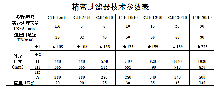 精密过滤器主要是除去压缩气中的油、液态水雾、尘。该系列产品具有效率高、使用方便、运行成本低,该产品根据不同的阶段分为C/T/A三级。C级过滤精度为≤3μm除99.9%游离状态的水分;T级过滤精度为≤1μm除99.99%游离状态的水分;A级过滤精度为≤0.01μm除99.999%游离状态的水分。